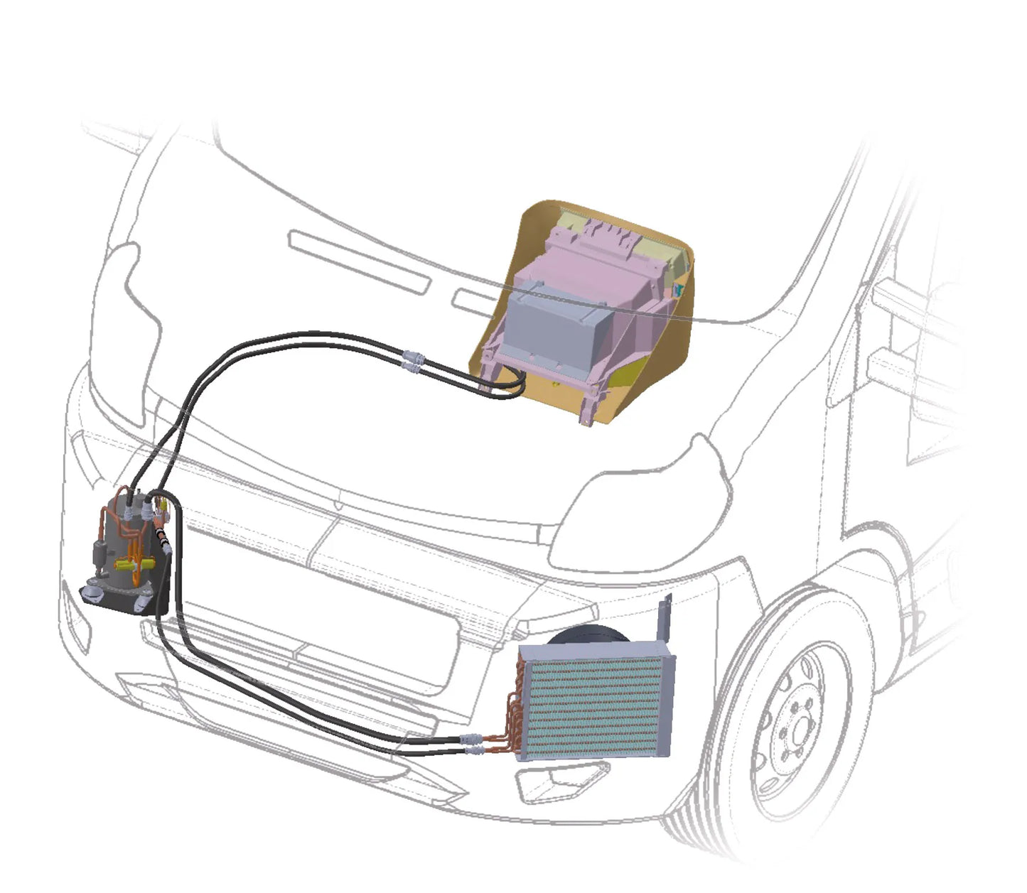- L'unité extérieure est composée de deux parties reliées par des tuyaux, montée derrière le pare-chocs du véhicule.